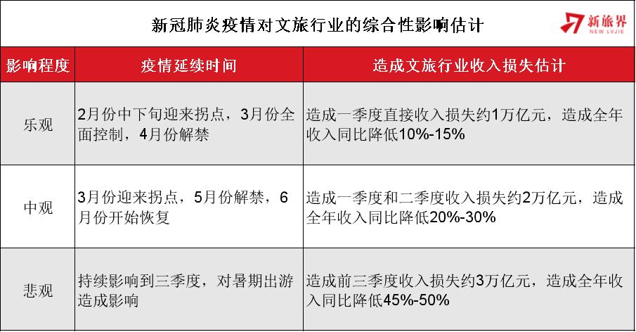 凭证文旅部数据中心统计, ,,,,,,2019年春节假期天下旅游总收入抵达5000亿元, ,,,,,,按春节假期收入占一季度收入50%-60%的比例估算, ,,,,,,预计一季度总收入约8500-10000亿元。。。。。。另据中国旅游研究院估算, ,,,,,,2019年整年文旅行业总收入约6.5万亿元。。。。。。由此估算, ,,,,,,2020年文旅工业收入损失额度约1万亿元, ,,,,,,会导致整年总收入同比降低15%。。。。。。若是乐观预计后三季度文旅消耗迎来高速增添, ,,,,,,整年负增添预计可以收窄到10%以内, ,,,,,,若是后续有更大的利好, ,,,,,,泛起出抨击性反弹, ,,,,,,负增添会进一步收窄。。。。。。